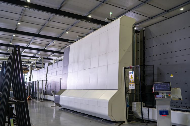 所有玻璃板(包括钢化玻璃和非钢化玻璃),都将在中空玻璃分拣缓冲器这里被分拣到中空玻璃生产序列中。缓冲器通过清洗机、扫描仪和检验站为三条 LiSEC TPA 中空玻璃生产线装料。中间这条生产线采用的是 LiSEC 物流解决方案 NWLD,用于处理旋转和倾斜镀膜的玻璃板。第一条和第二条生产线加工尺寸在 3.5 米以内的玻璃,第三条生产线可加工尺寸在 5.0 米以内的玻璃。