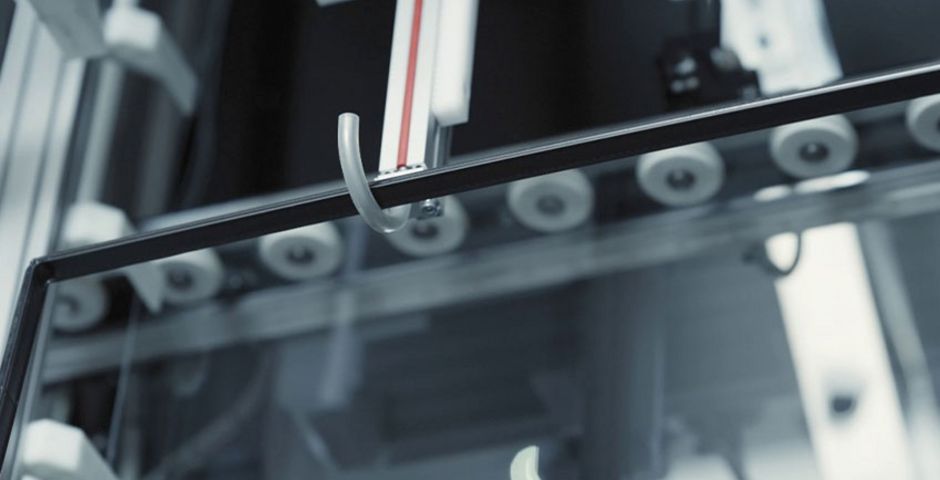 Une barre à rouleaux horizontale est positionnée précisément le long du bord supérieur du verre au moyen d’un entraînement servocommandé et de plusieurs capteurs. Le guidage latéral est effectué via les axes verticaux composés de profilés système et de guidages à rouleaux.