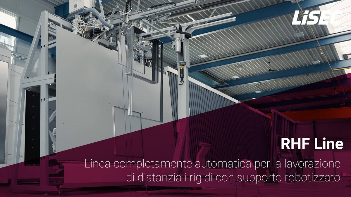 RHF-A25/25 si compone fondamentalmente di un robot a braccio snodato con sei assi e del sistema di pinze per telai montato su di esso. I telai vengono preferibilmente prelevati da un estrusore automatico del butile e posizionati contro il vetro, il quale viene allineato sulla linea di vetro isolante nel punto richiesto.